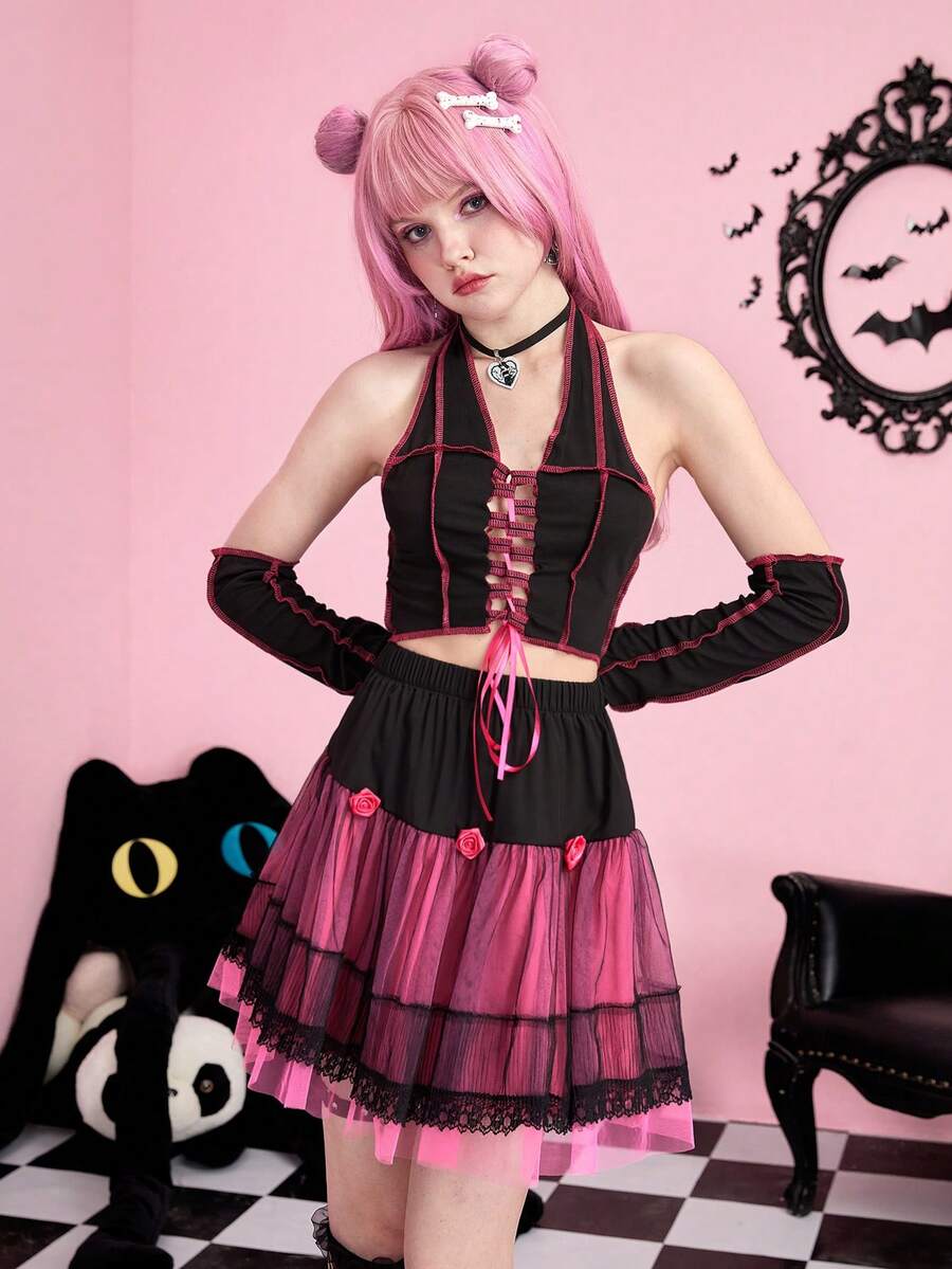 Kawaii Gonne color block pizzo a contrasto sovrapposizione maglia