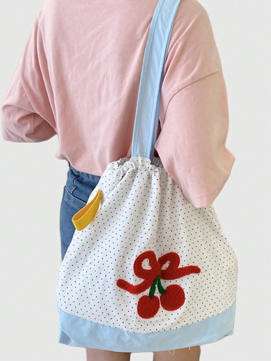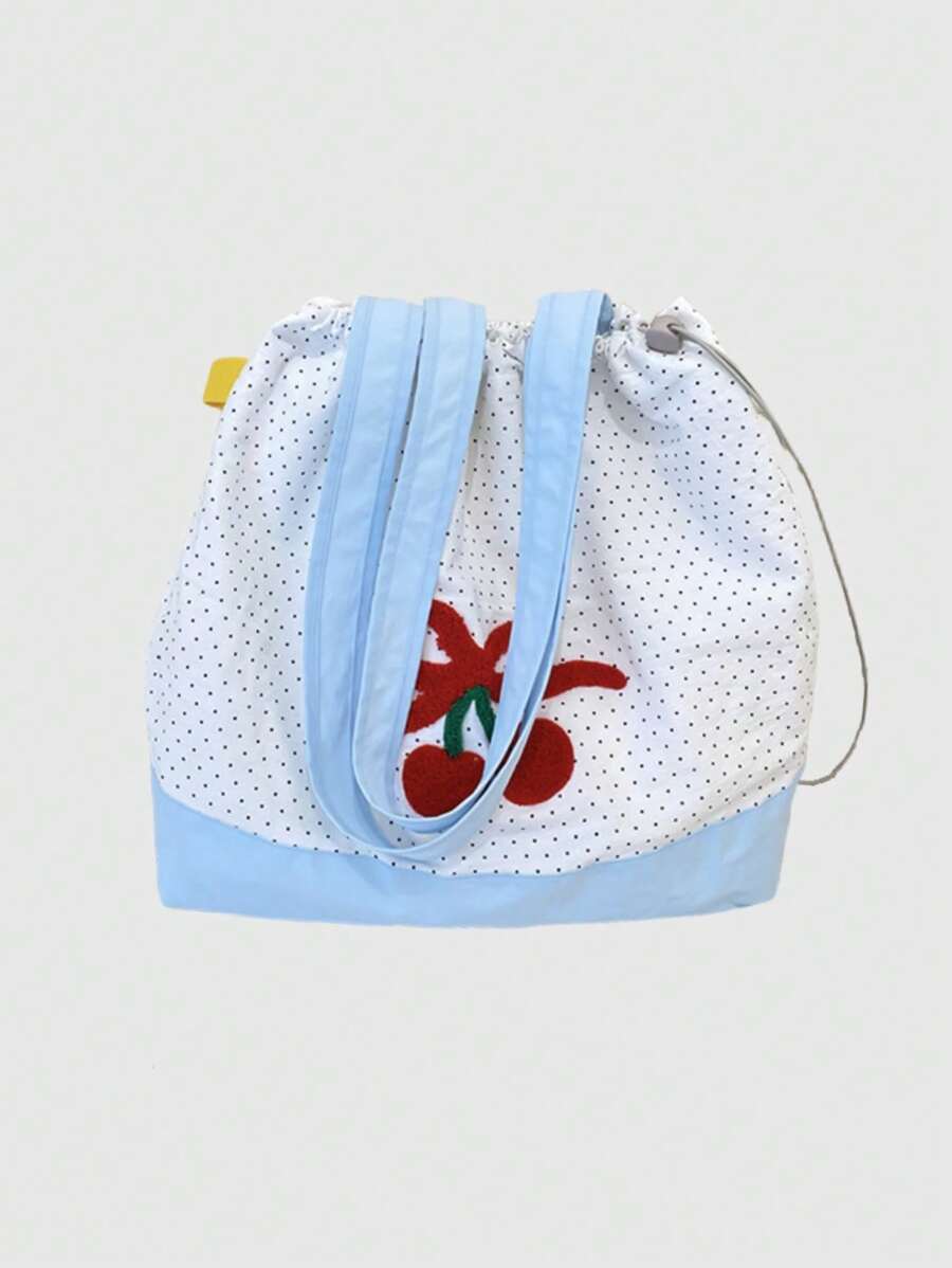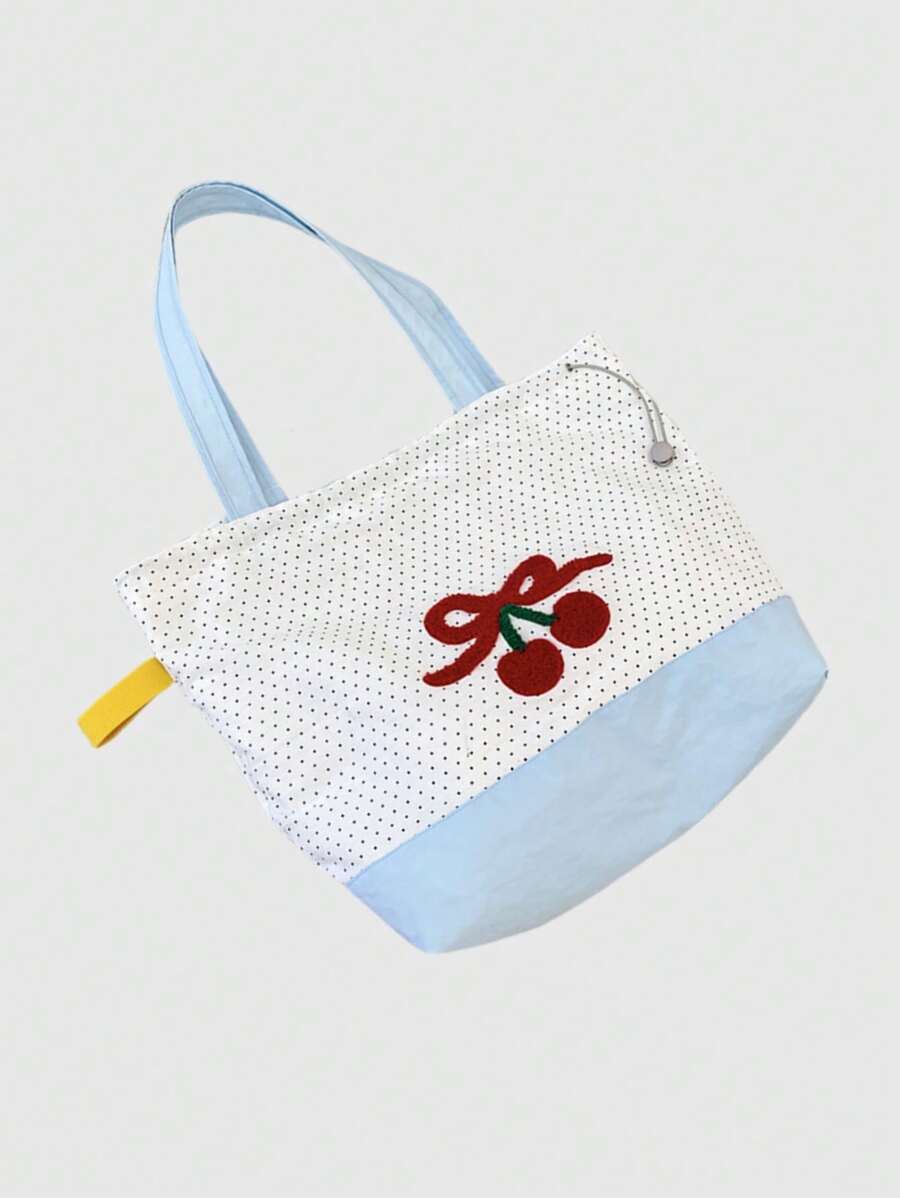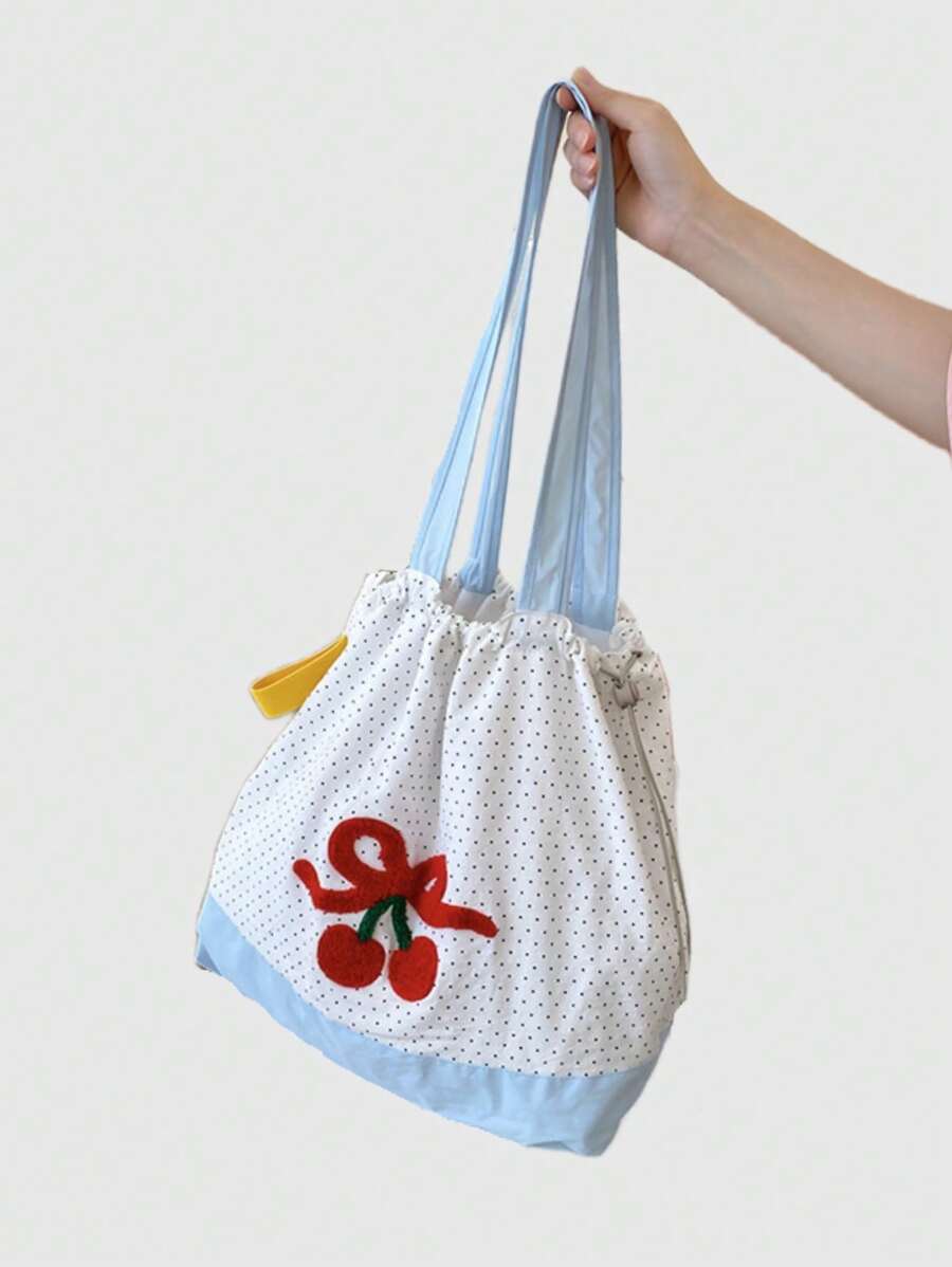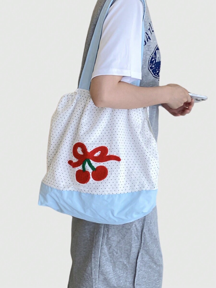 Kawaii Borsa tote a tracolla da donna con capacità ampia, a pois, con ricamo a ciliegie, stile casual