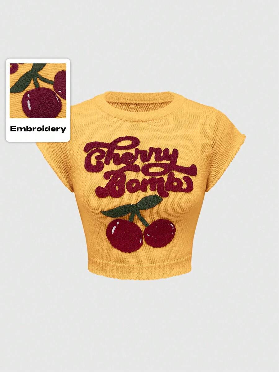 Kawaii Maglione da donna con collo alto, maniche a lanterna e ricamo di ciliegie, in stile collegiate carino e innocente