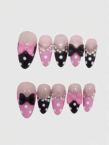 Kawaii Punte di unghie finte in stile ballerina con bordo in pizzo, fiocco romantico, ali bianche a forma di cuore e note musicali in metallo rosa, prodotte in serie per un look energico e adatte per uscite quotidiane e appuntamenti