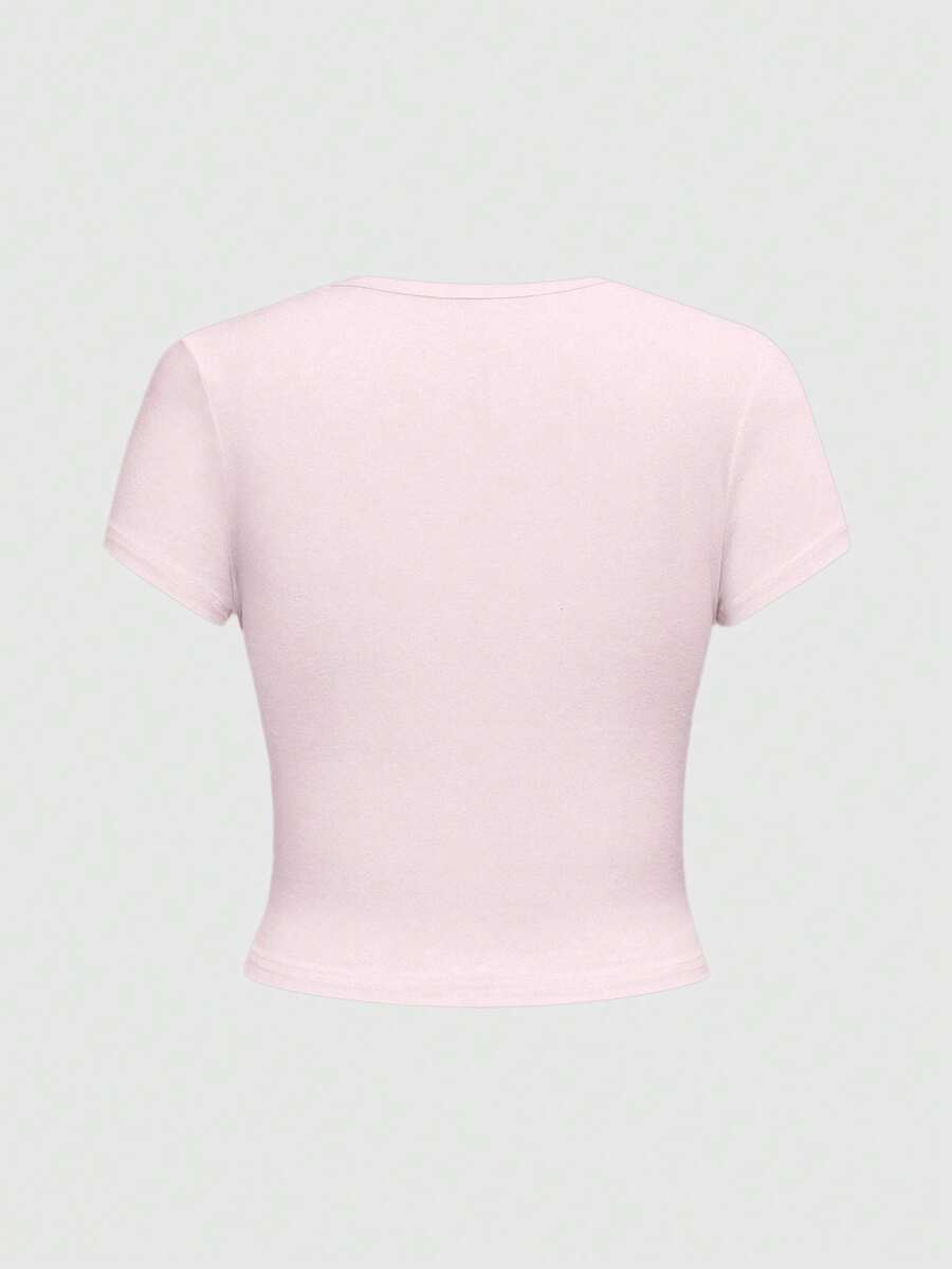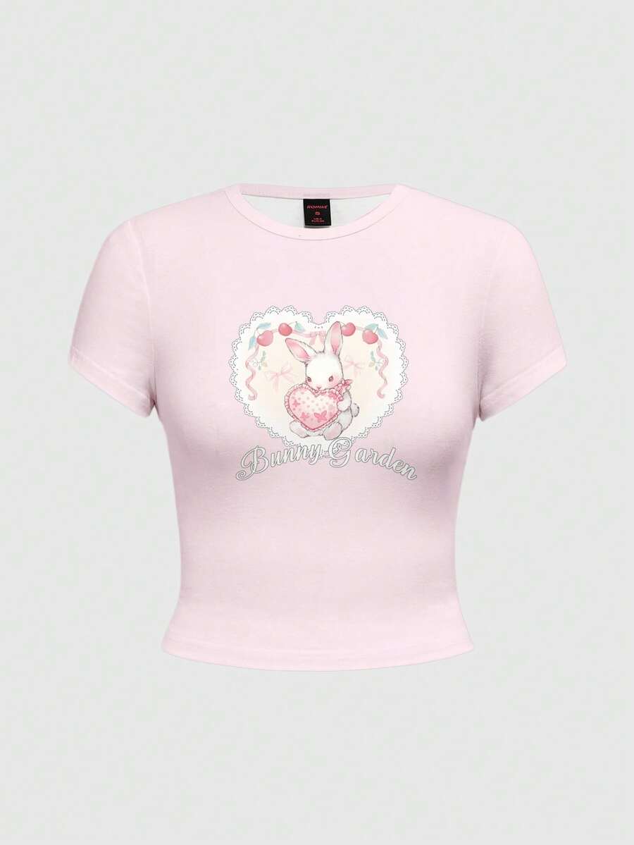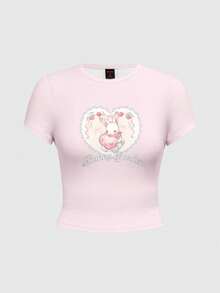 Kawaii Maglietta a maniche corte da donna con stampa a cuori di pizzo, coniglietti e stile college innocente e sexy