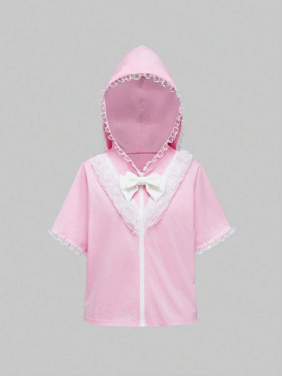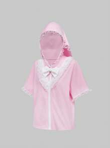 Kawaii Maglietta con cappuccio a maniche corte con decorazione a orecchie di coniglio carina
