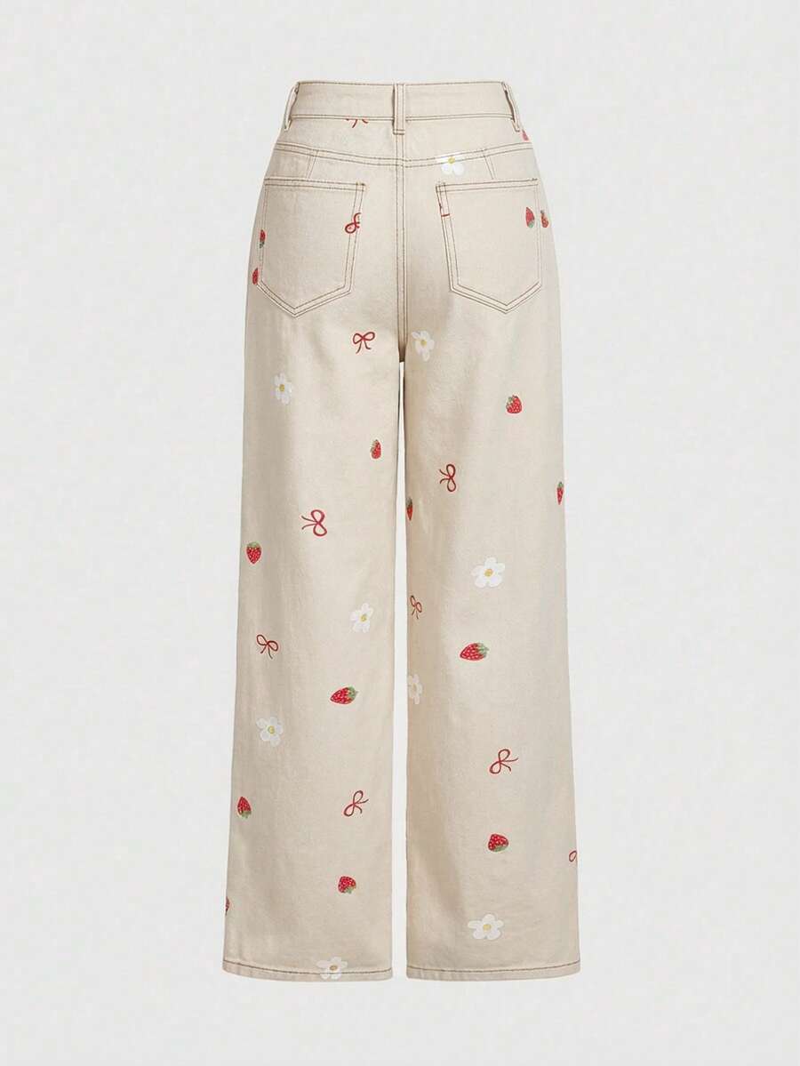 Kawaii Jeans di jeans da donna con stampa carina di fragole, fiori e fiocchi, per primavera/estate