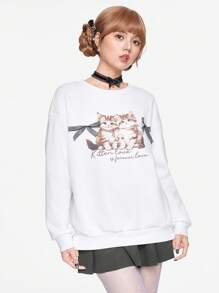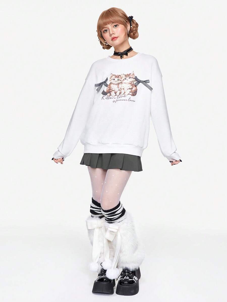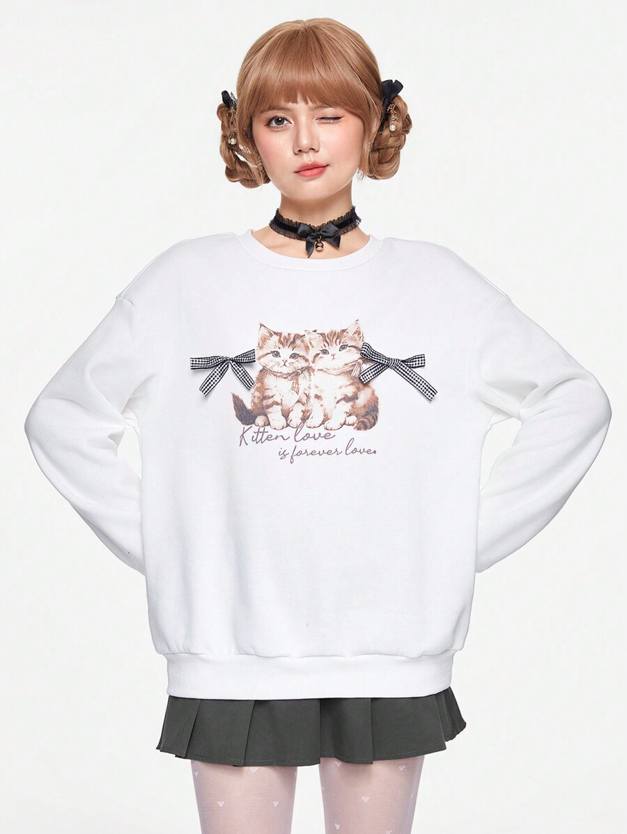 Kawaii Felpa da donna Himekaji con stampa carina e dolce di gatti e decorazione con fiocco