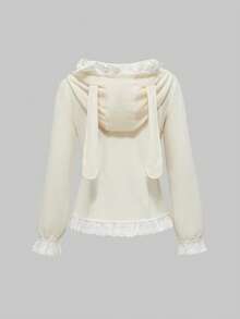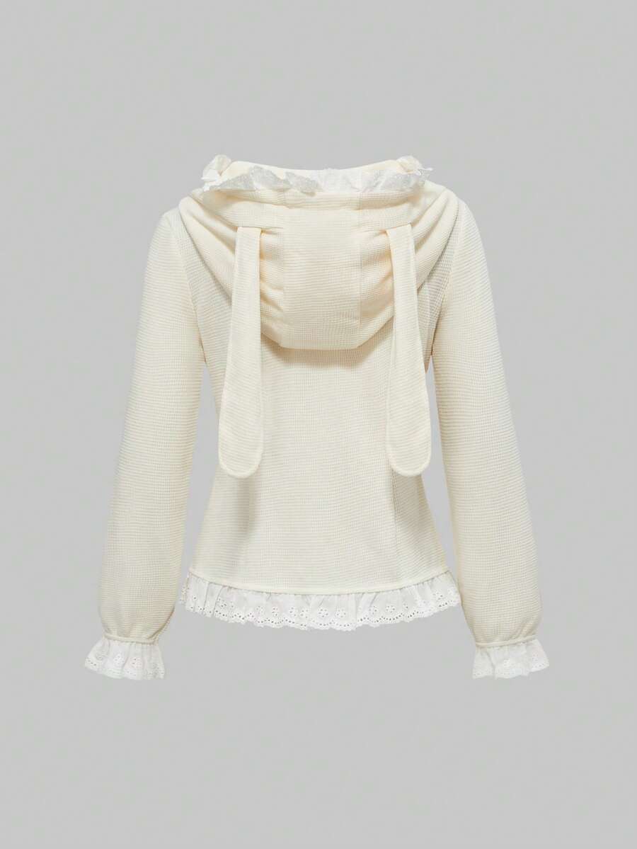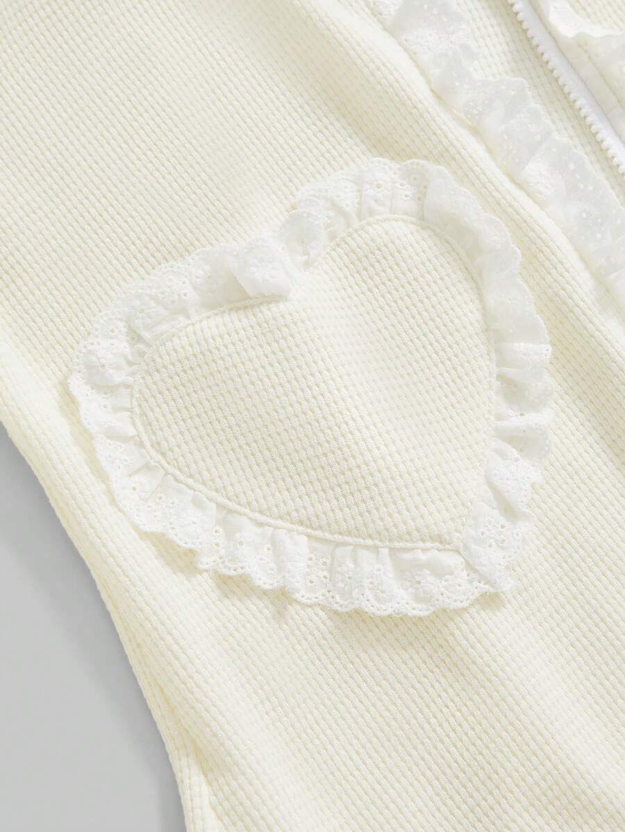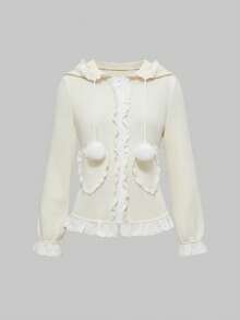 Kawaii Felpa con cappuccio da donna con taschino a forma di cuore e rifiniture arricciate