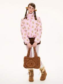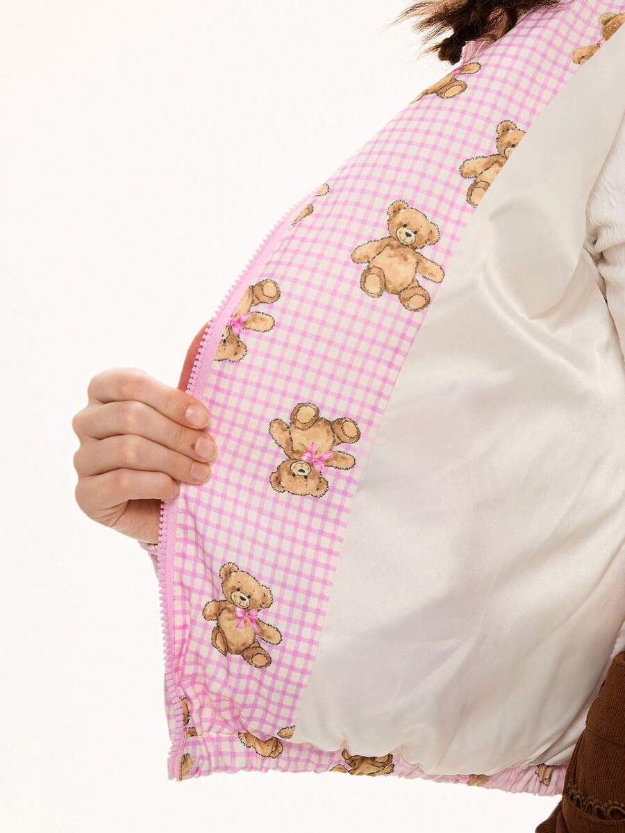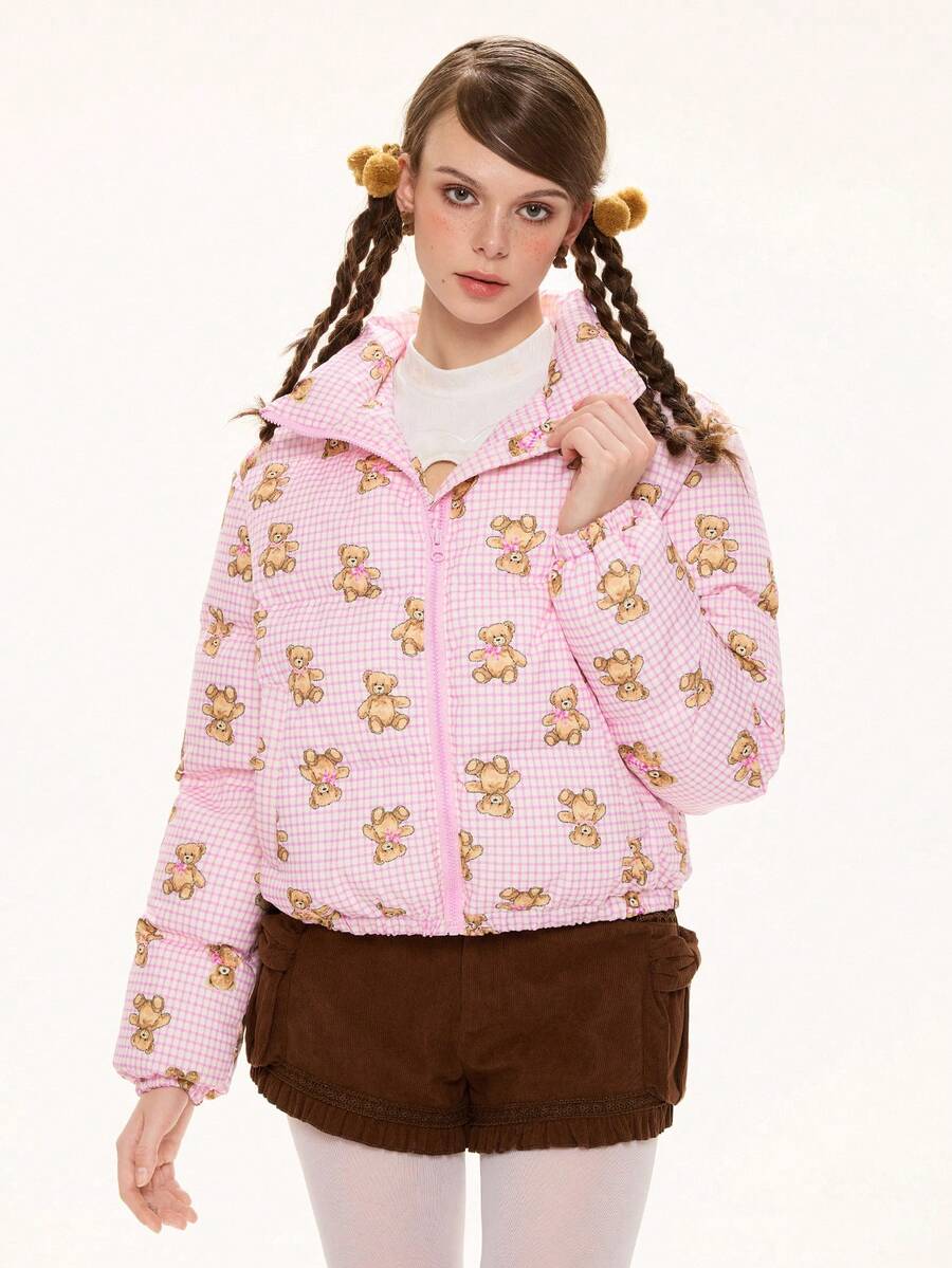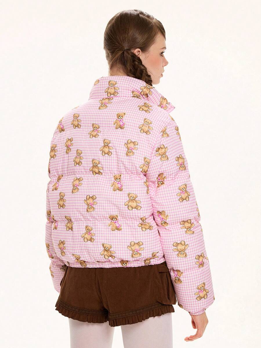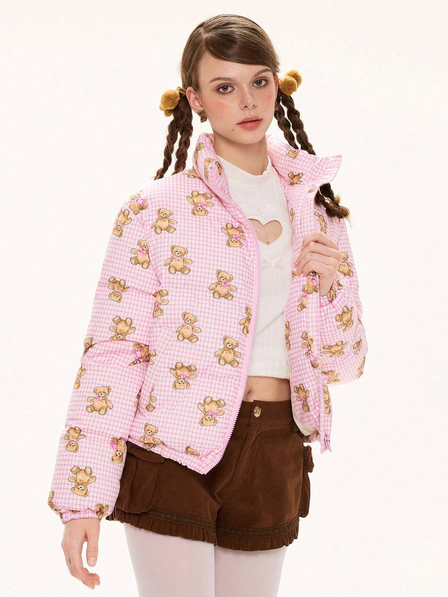 Kawaii Cappotto imbottito con vestibilità ampia e stampa a quadri con orsetto carino e dolce