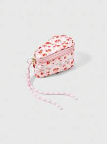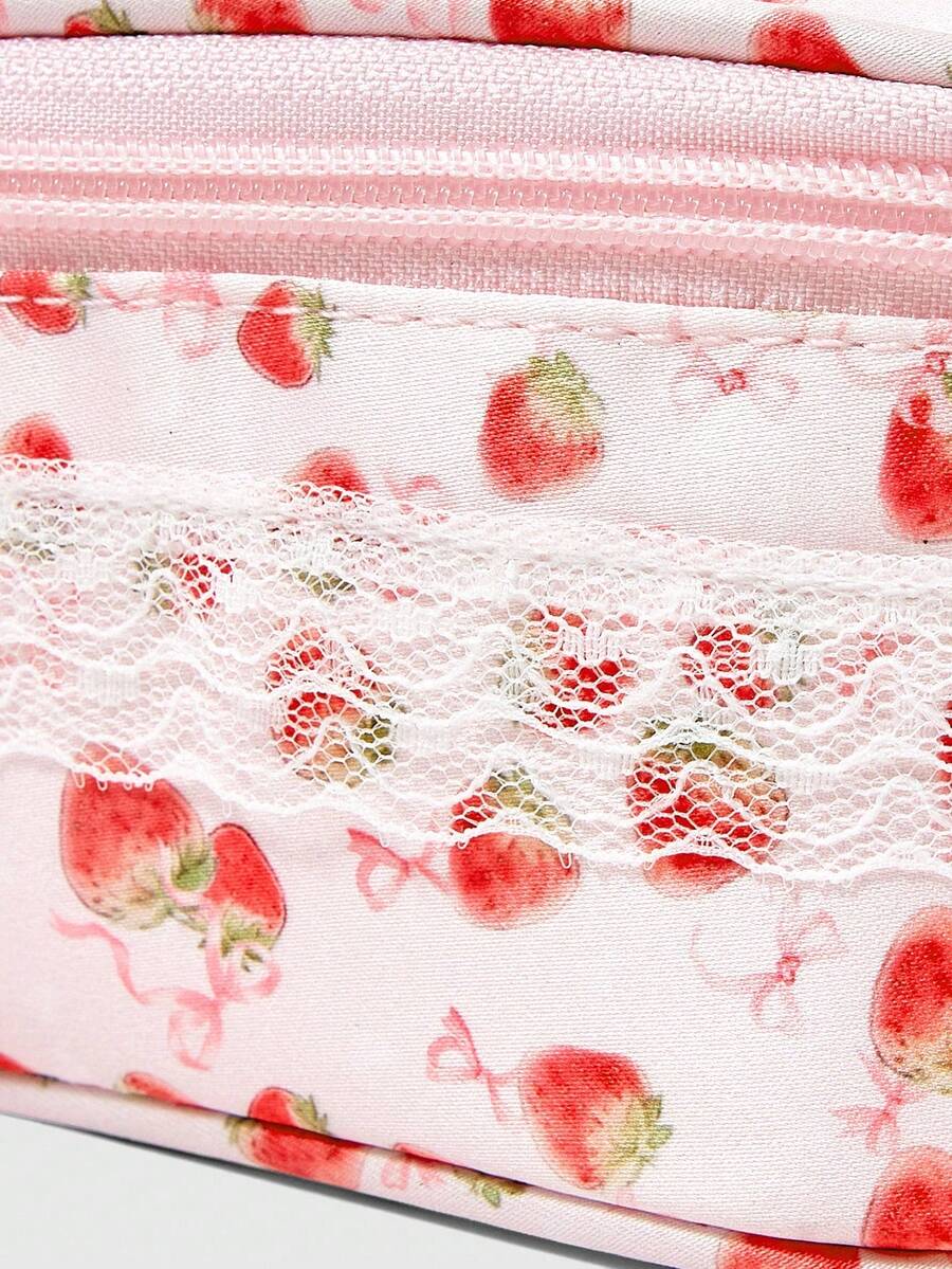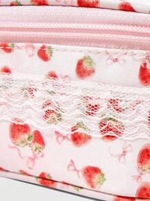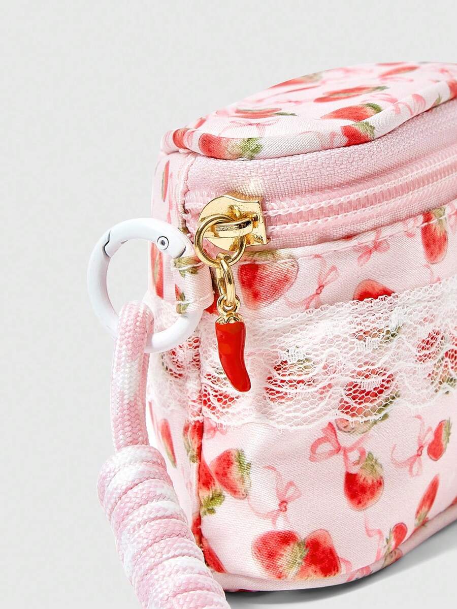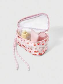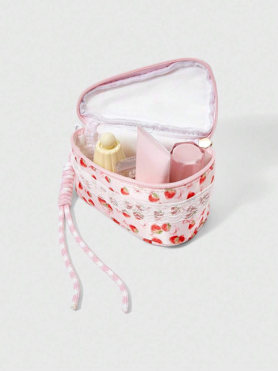 Kawaii Borsa trucco alla moda, di colore rosa perla con fiocco e motivo a fragola, borsa cosmetica portatile e femminile di piccole dimensioni