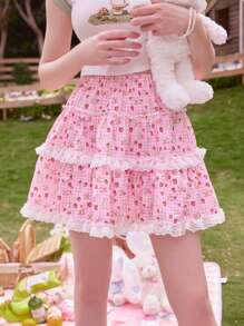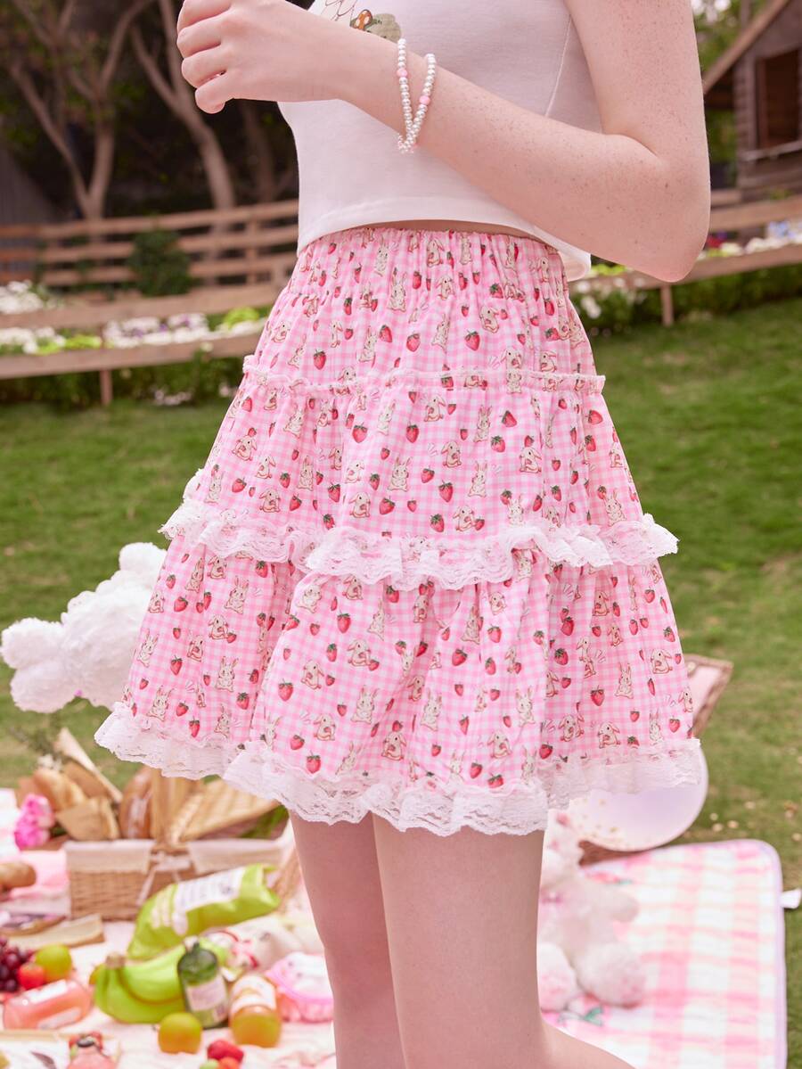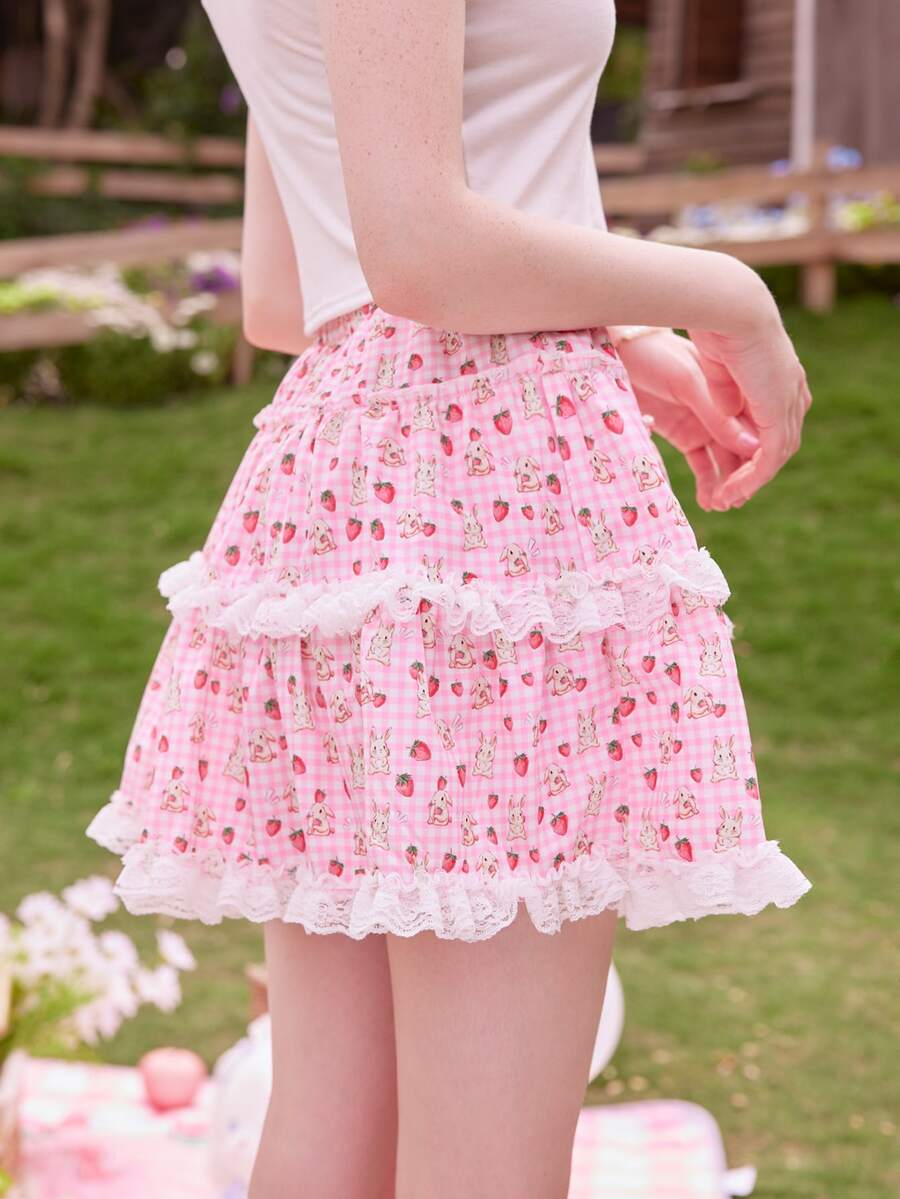 Kawaii Gonne a quadri con grafica fumetto orlo di pizzo