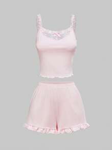 Kawaii Set di pigiama casual con cuori, maglia semplice, pizzi, rifiniture arricciate, inserti in rete a forma di cuore