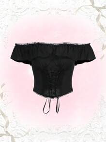 Kawaii Camicetta con lacci frontale con bordo a volant con spalle scoperte arricciato