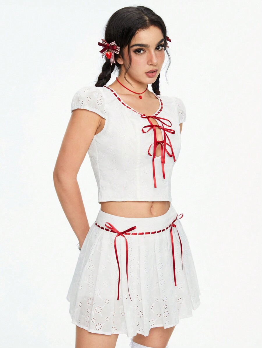 Kawaii Adorabile completo due pezzi da donna a contrasto con texture jacquard e fiocco progettati