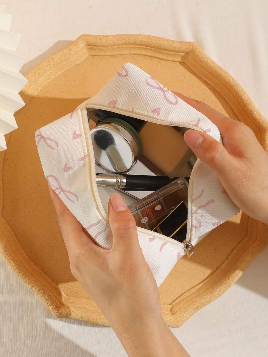 Kawaii Borsa cosmetica ottagonale in velluto con stampa a fiocco rosa