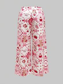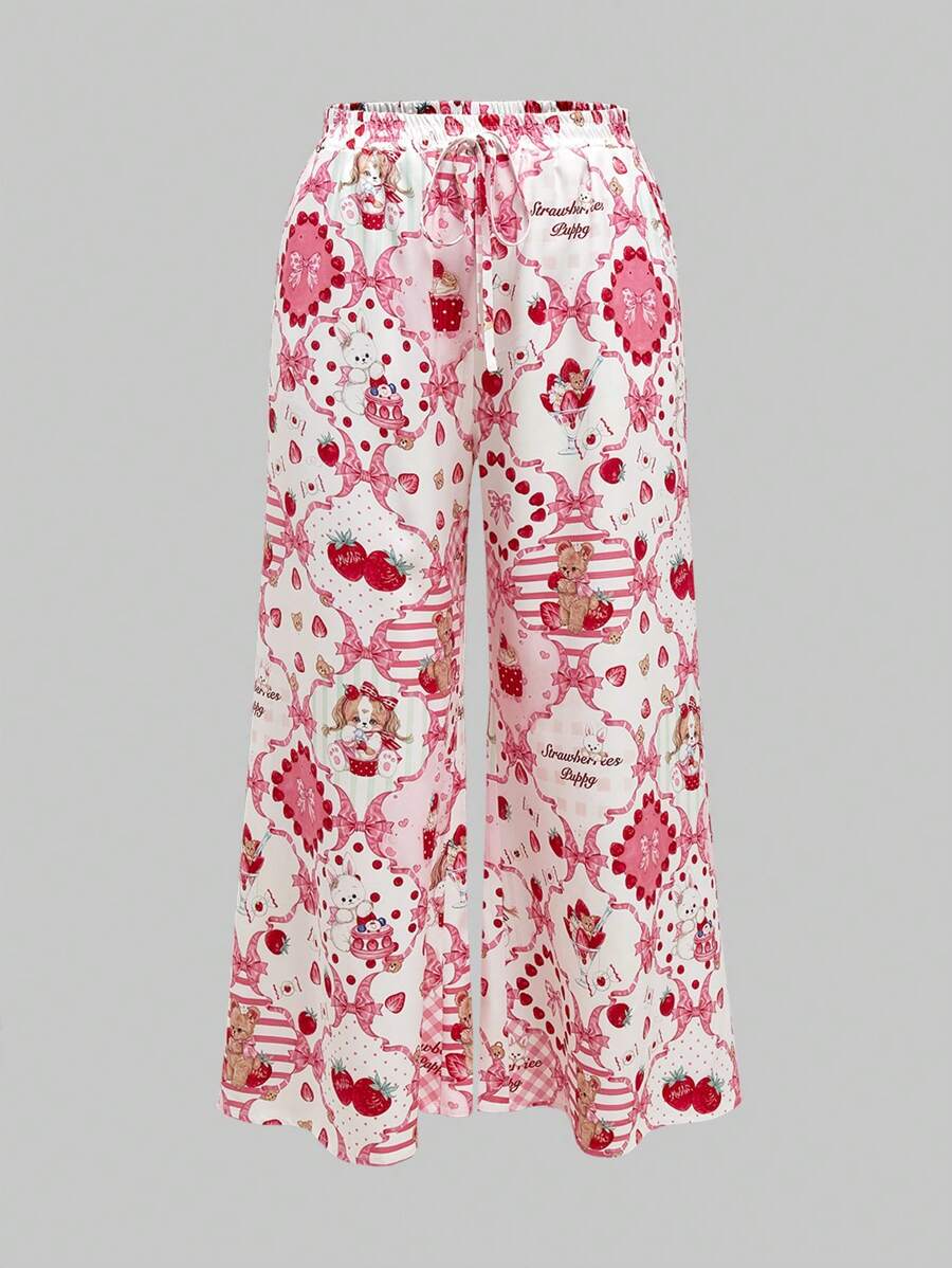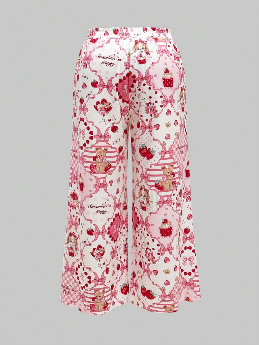 Kawaii Pantaloni dritti a vita alta da donna taglie comode con stampa orsetto e fiocco a quadri