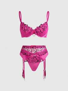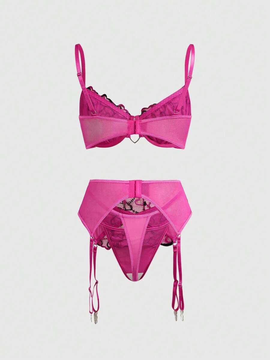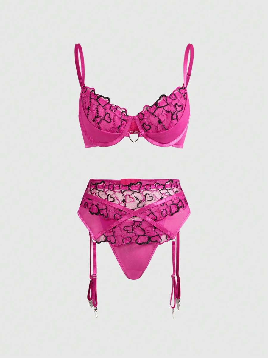 Kawaii Set di lingerie romantica per San Valentino, composto da reggiseno con ferretto, perizoma e reggicalze in rete con ricamo a cuori