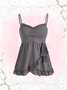 Kawaii Top a canotta babydoll con balze e arricciature sul fondo di colore unito