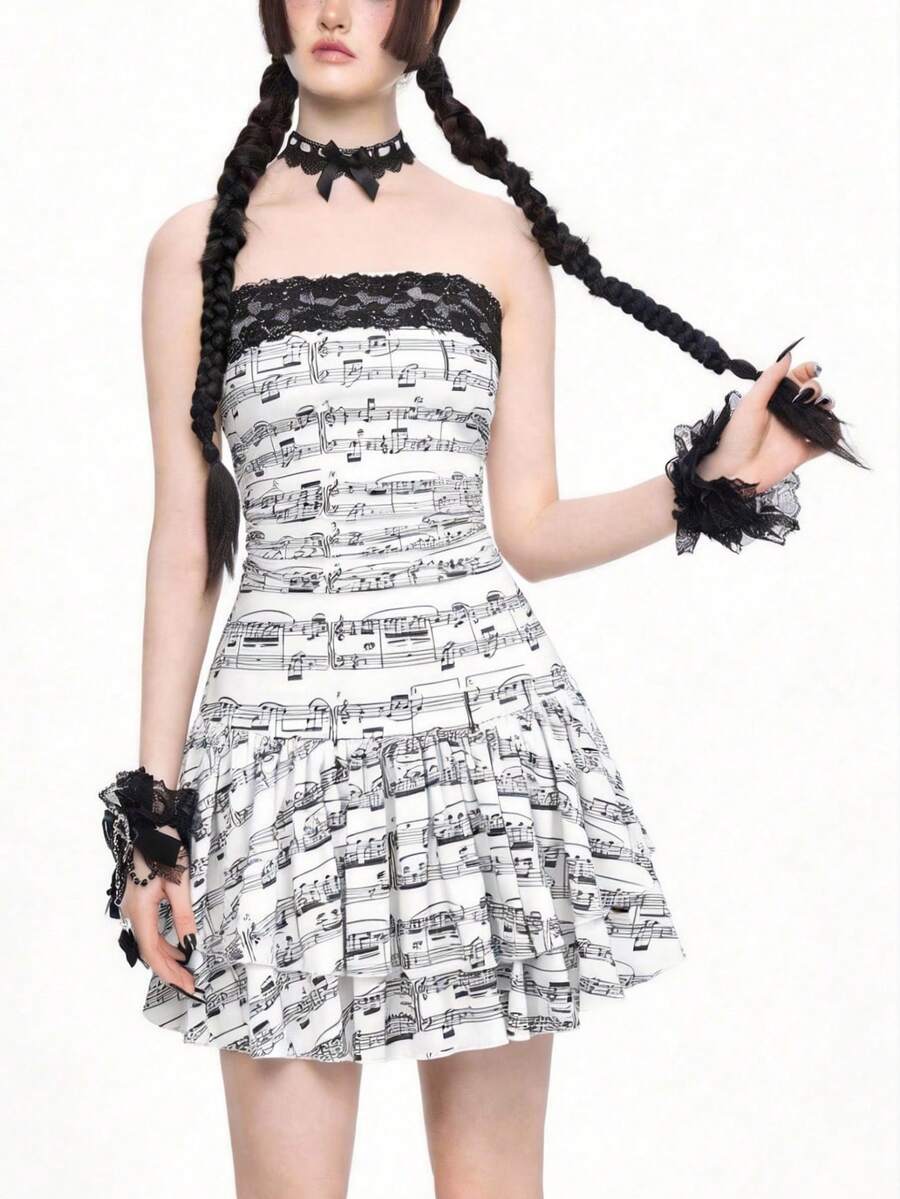 Kawaii Abito mini aderente da donna in stile Y2K con stampa a note musicali, colore a contrasto e balze in pizzo sul fondo