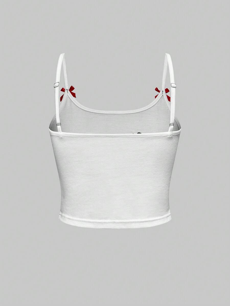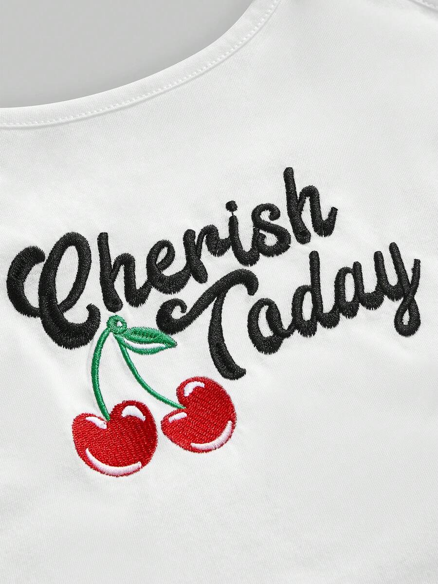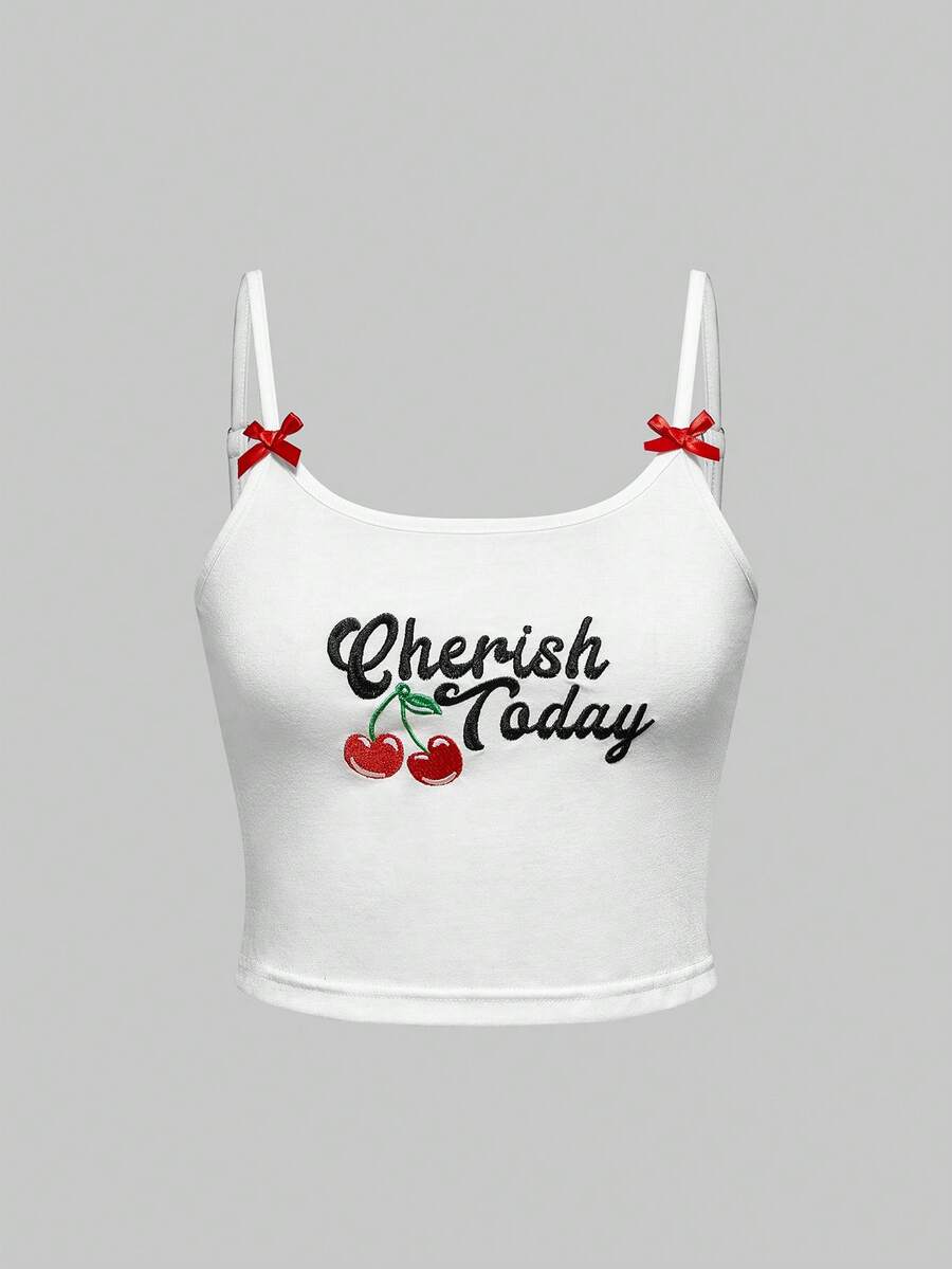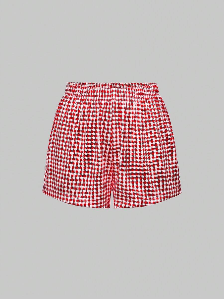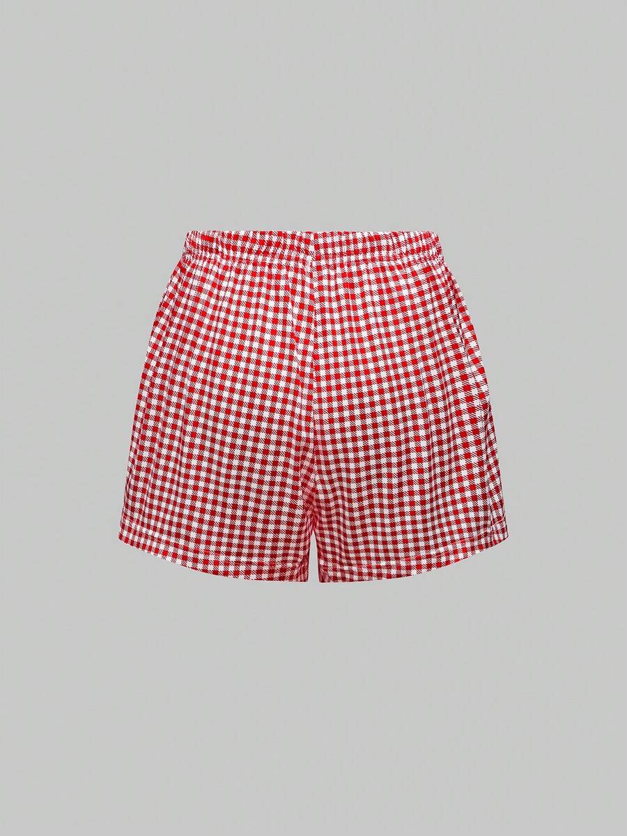 Kawaii Pigiama casual da donna con canotta ricamata con lettera e fiocco a ciliegie e pantaloncini a quadri