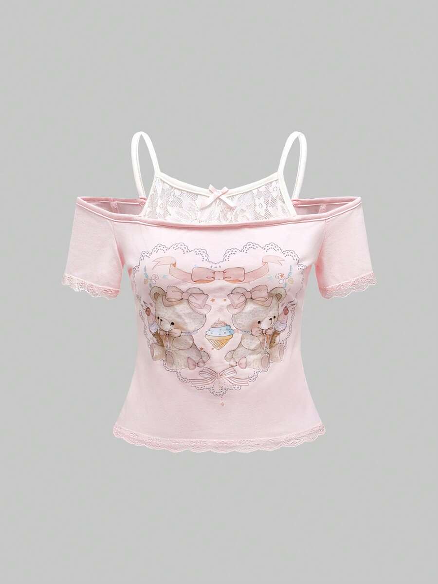 Kawaii Maglietta da donna stile "Himekaji" 2 in 1 con pizzo a contrasto, stile carino con orsetto a cuore e fiocco in pizzo, adatta per la scuola