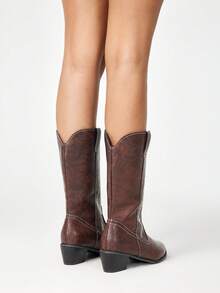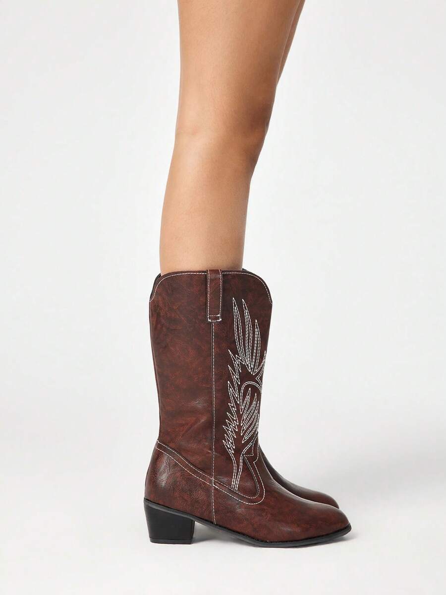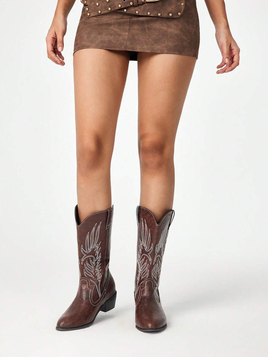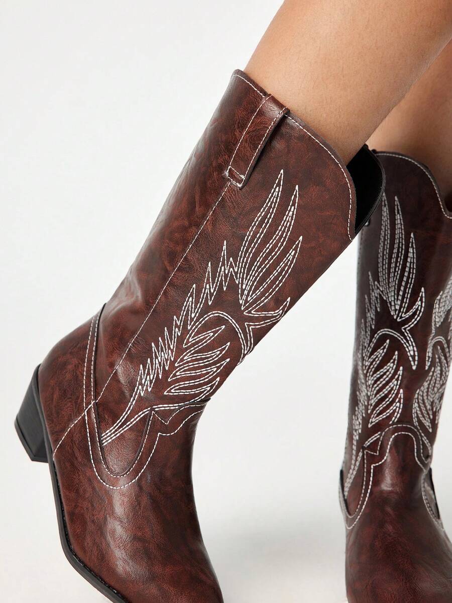 Kawaii Stivali da cowboy donna a punta con tacco largo, ricamati, alla caviglia, colore marrone caffè
