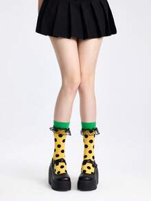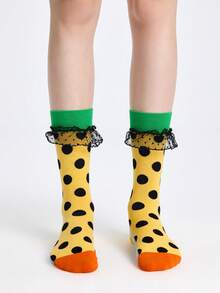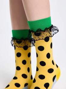 Kawaii Calzini alla caviglia da donna con motivo a pois, inserti in rete e bordo arricciato, carini