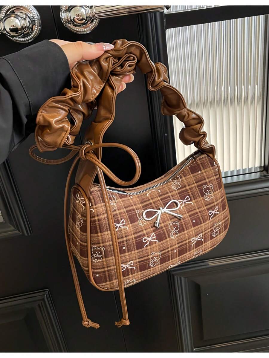 Kawaii Borsa a spalla retrò da donna con motivo a quadri e fiocco francese, borsa elegante e romantica da portare sotto braccio, adatta per l'autunno/inverno