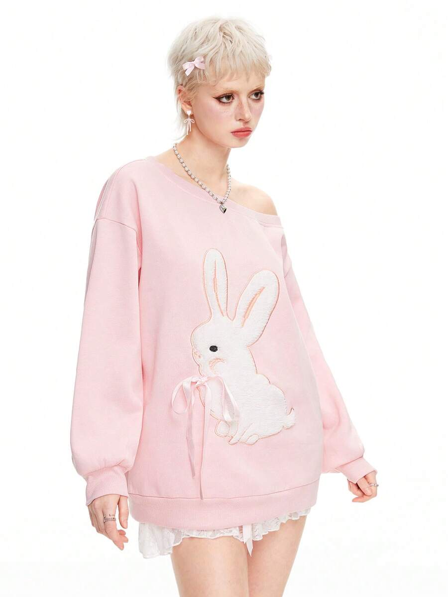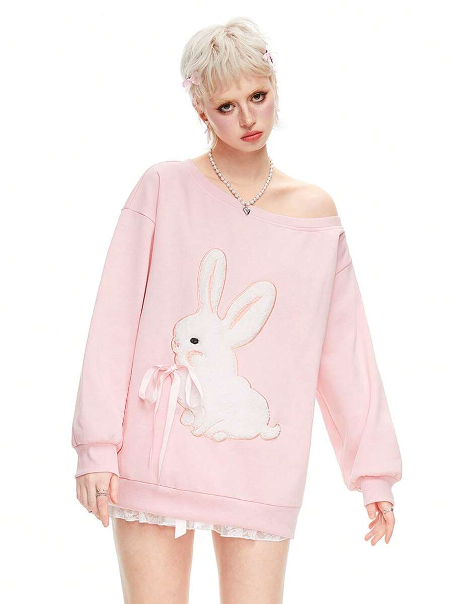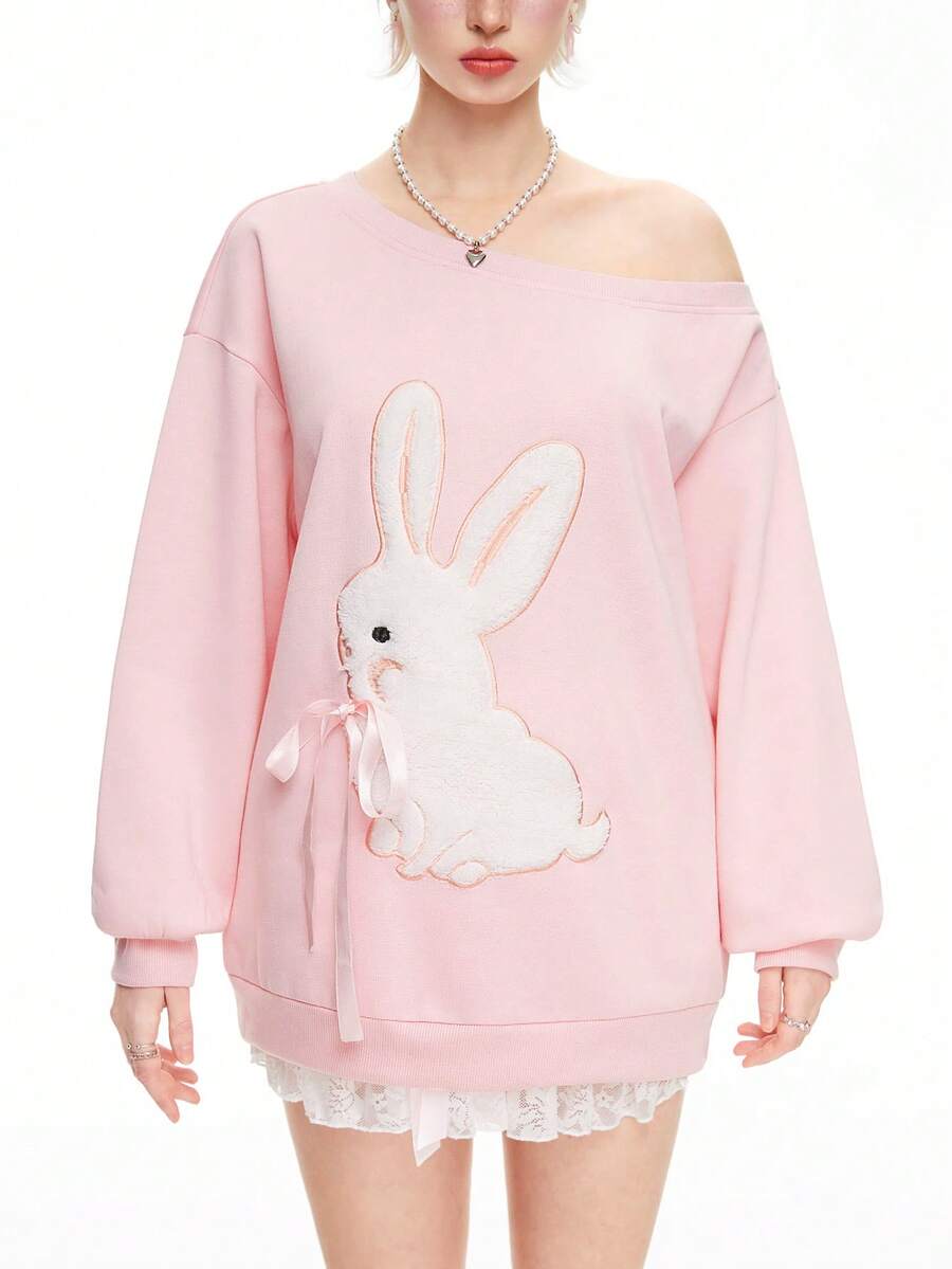 Kawaii Maglione casual dolce con colletto asimmetrico, ricamo di coniglio e fiocco decorativo per donne in primavera e autunno