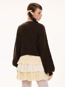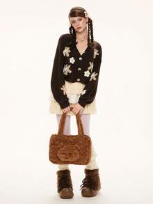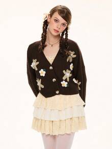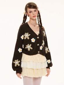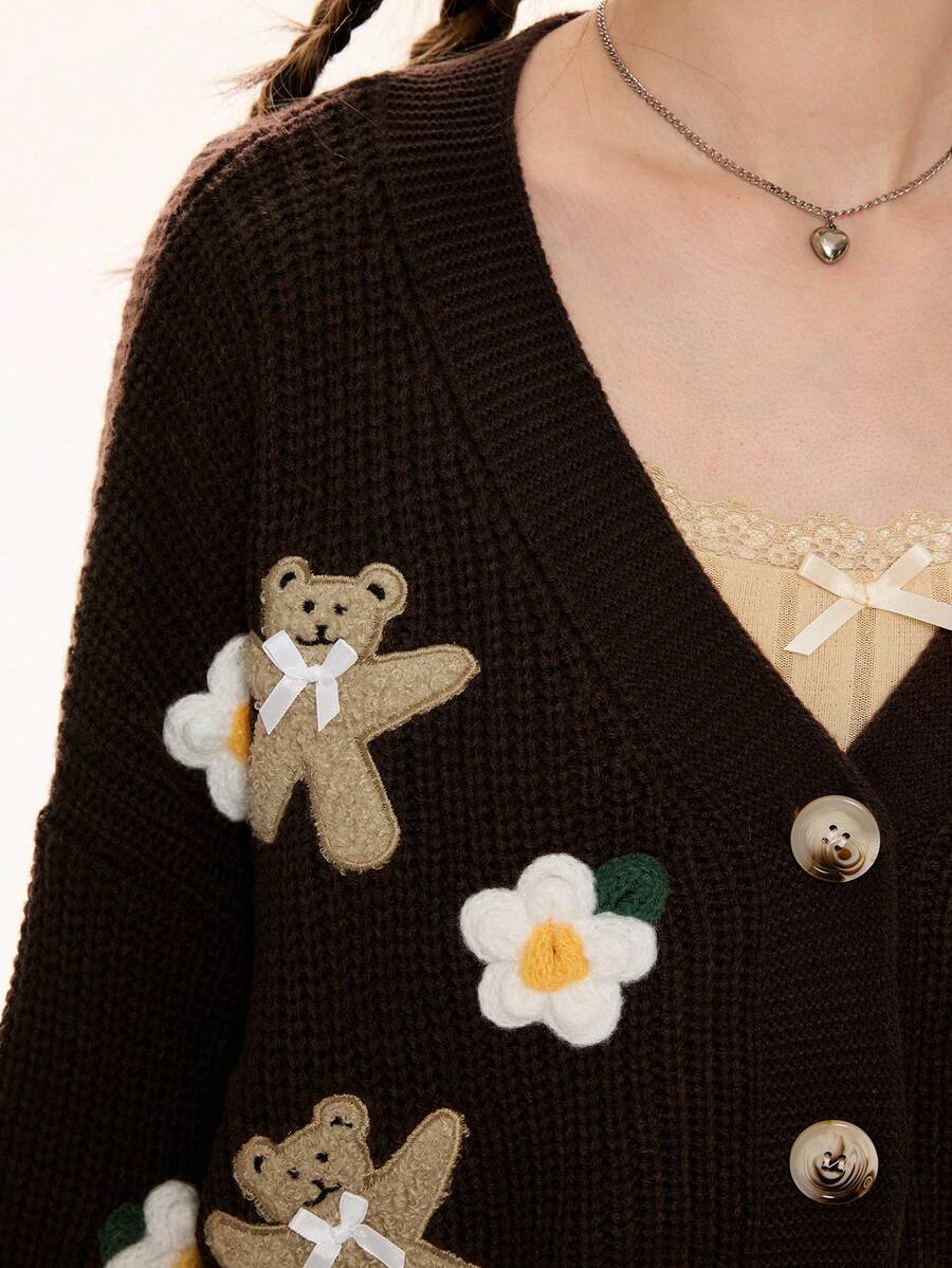 Kawaii Cardigan a maniche lunghe da donna con scollo a V, decorato con ricamo di orsetti e fiori, con spalle scoperte