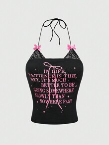 Kawaii Top canotta con stampa a lettere, fiocco e pizzo sul bordo, in stile Y2K