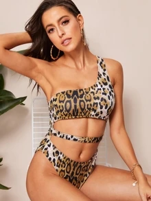 Costume da bagno capestro con stampa leopardata e spalla scoperta