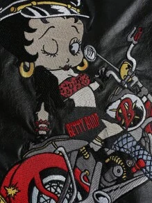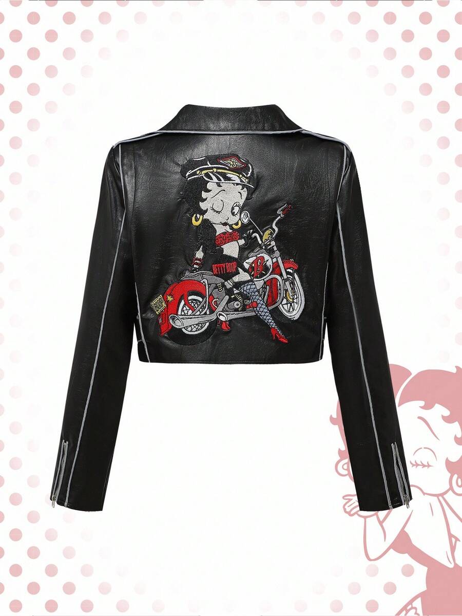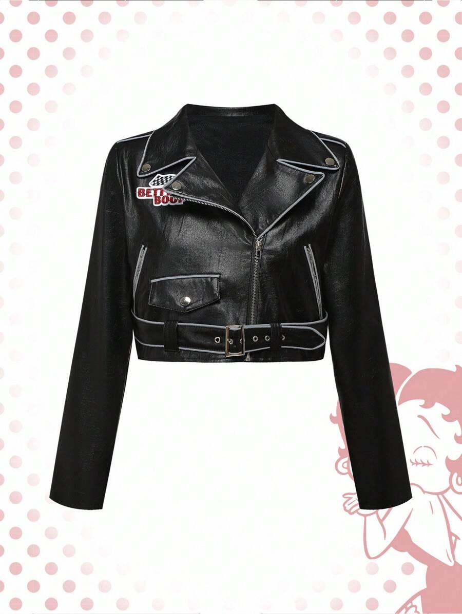 Betty Boop | ROMWE Giacca imbottita in pelle PU con ricamo grafico a lettere e blocchi di colore in stile Y2K per motociclista e biker da donna