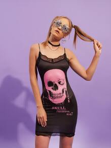 Abito aderente con orlo in pizzo con stampa di lettere e cranio