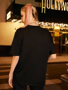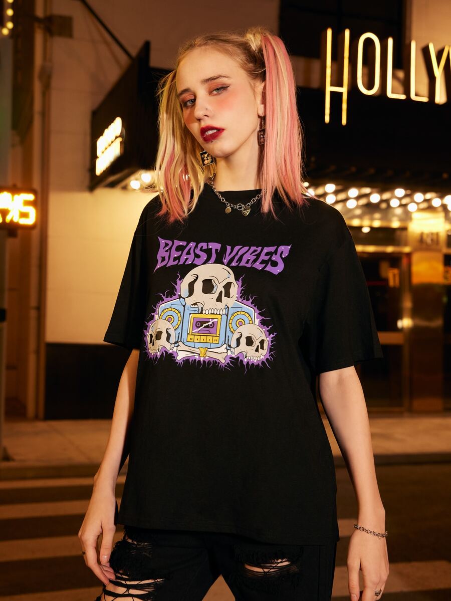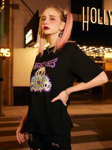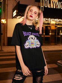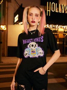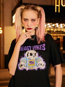 Maglietta con spalla cadenti lettere cranio & Radio grafico