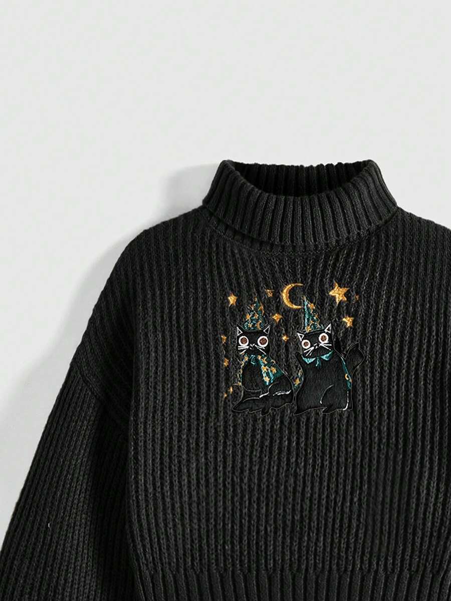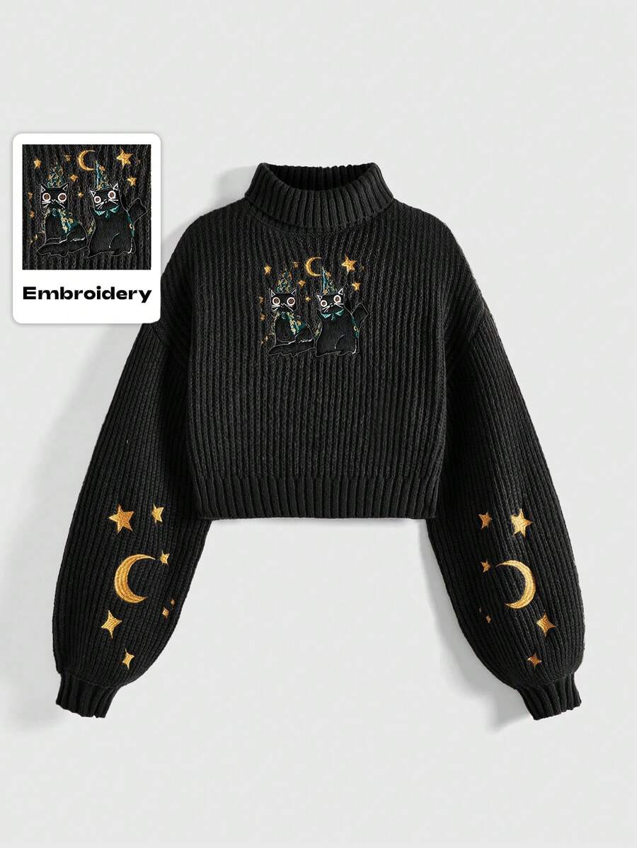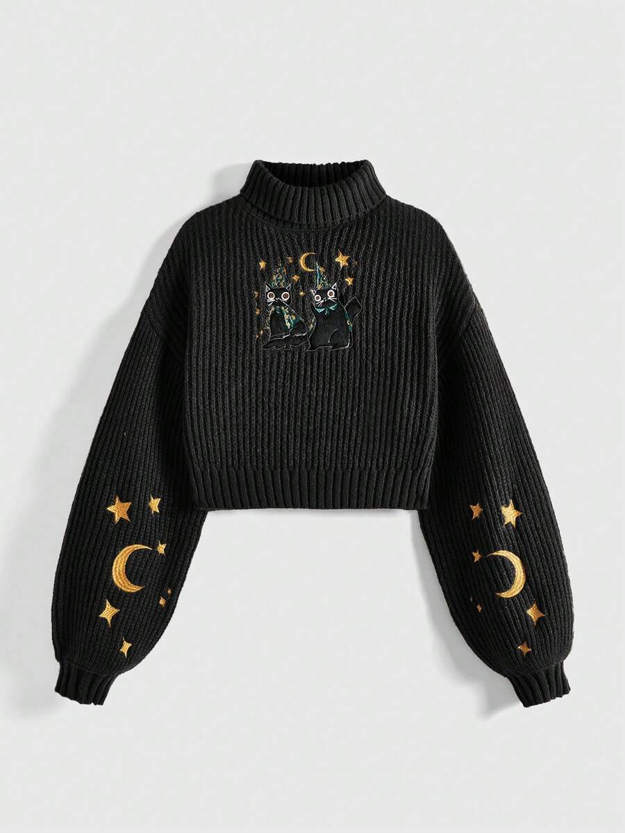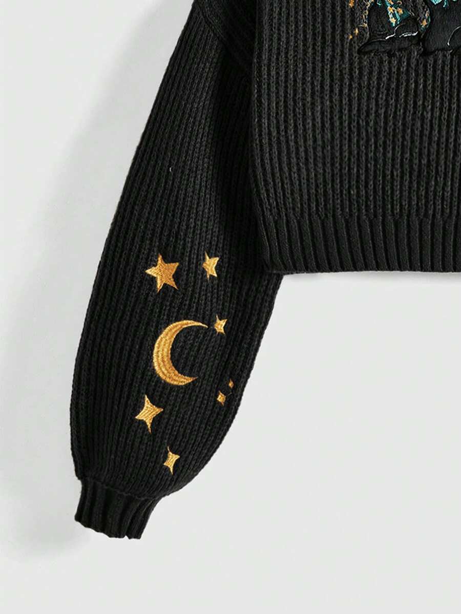 Maglione girocollo a maniche lunghe con ricamo di gatto misterioso e luna