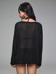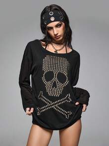 Grunge Punk Maglietta a maniche lunghe con girocollo oversize, con grafica di teschio, borchie e strass