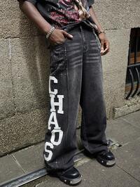 Jeans in denim blu a vestibilità larga da uomo con lettere e grafica stampate, gamba dritta, lungo, ricamato, modello skater, stile cargo, graffiti, semplice, luminoso, prom, Y2K, amici Jeans cargo neri semplici, slim fit, con strappi, vita con coulisse, effetto consumato, in cotone, adatti per marito, fidanzato, uscite, passeggiate, parchi nazionali, stile grunge
