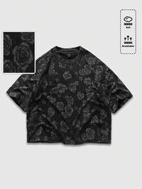 Street Life Maglietta oversize nera da uomo con motivo a fiamma e strass rotondi, streetwear per uso casual quotidiano, autunno