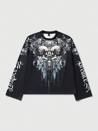 Goth maglietta larga da uomo con stampa a contrasto di croce e ali, stile casual estivo da strada punk