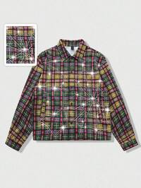 Street Life Camicia casual da uomo con vestibilità comoda, a quadri, con decorazioni di lettere e perle artificiali, a maniche corte