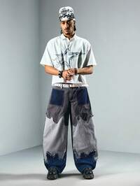 Jeans larghi e ampi casual da uomo, stile streetwear, con tasche, cuciture a contrasto e design patchwork