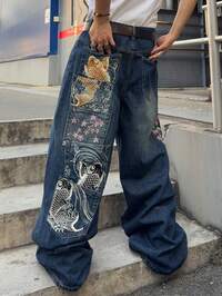 Anime Jeans in denim con vestibilità ampia e ricamo di dragone per uomo