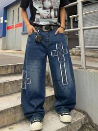 Jeans casual da uomo, stile di strada, con motivo a croce, lavati, ampi e con gamba larga