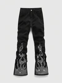 Jeans da uomo con gamba a zampa di elefante, stampa a fiamma e strass sulla tasca