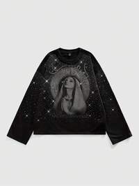 Maglietta a maniche lunghe da uomo con stampa grafica e decorazioni in strass, vestibilità ampia, scollo a equipaggio, adatta per uso quotidiano, primavera/estate