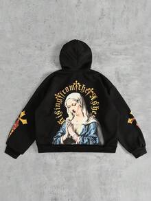 Street Life Felpa con cappuccio da uomo con stampa grafica di croce e figura, stile vintage da strada
