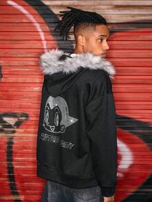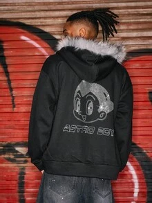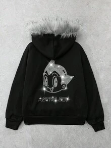 Astro Boy X ROMWE Felpa con cappuccio, zip e decorazione di strass a forma di lettera, adatta per uso quotidiano, autunno/inverno, da uomo