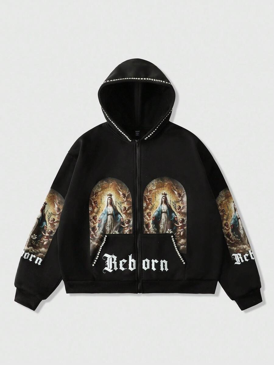 Street Life Felpa oversize da uomo con stampa religiosa scintillante con diamanti, stile vintage da strada, autunnale