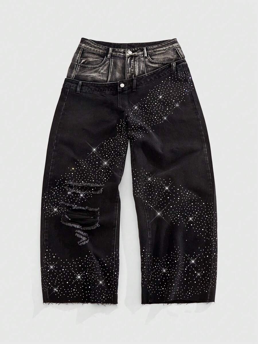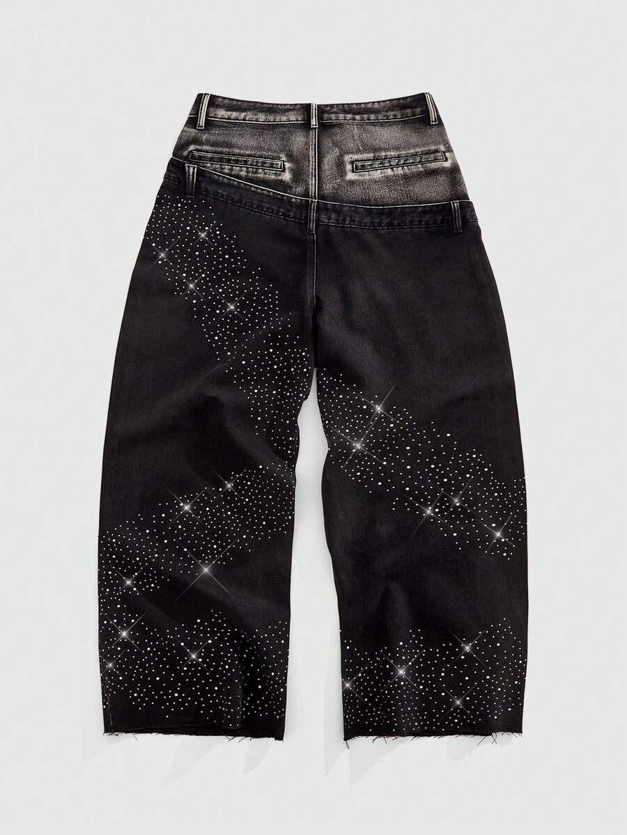 Street Life Jeans da uomo alla moda con decorazione in strass e vita a doppio strato
