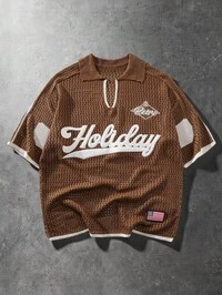 Casual Polo a maniche corte da uomo, a maglia, con stampe di lettere e righe, adatta per l'abbigliamento da vacanza