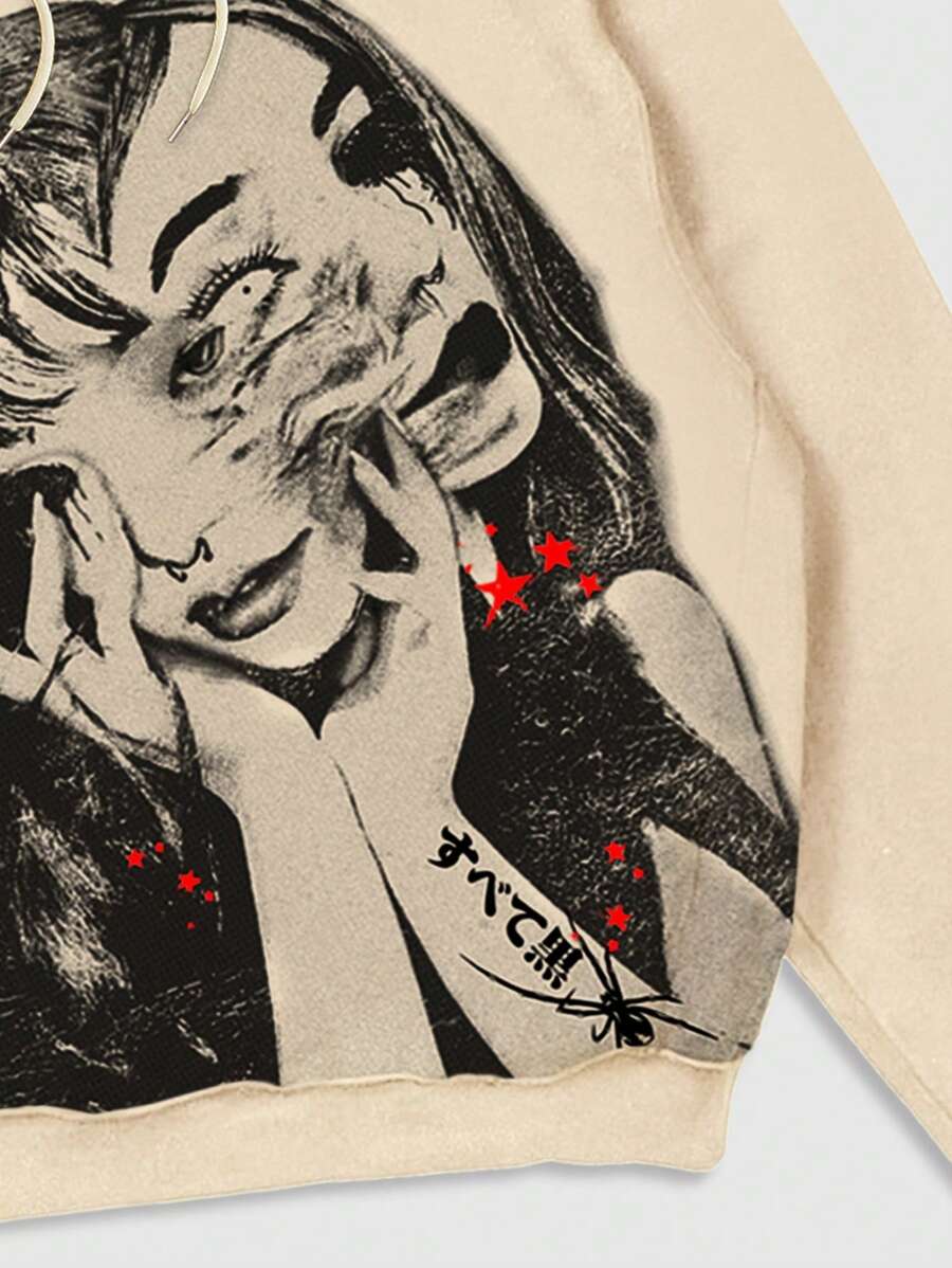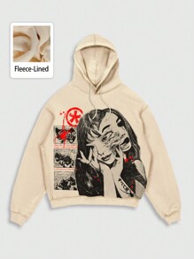 Anime Felpa con cappuccio in pile con stampa di slogan e ritratti, cappuccio con cordoncino,adatta per uomo, autunno/inverno