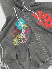 Street Life Felpa con cappuccio e chiusura lampo da uomo, stile vintage, con stampa 3D di stelle e lettere, effetto consumato, autunnale